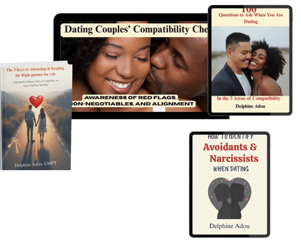 Delphine Adou is a Marriage & Family Therapist, keynote speaker, and relationship coach. With years of experience guiding singles and couples toward conscious, lasting love, her work blends clinical insight, spiritual awareness, and grounded emotional tools.